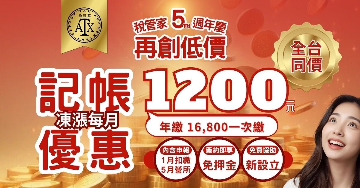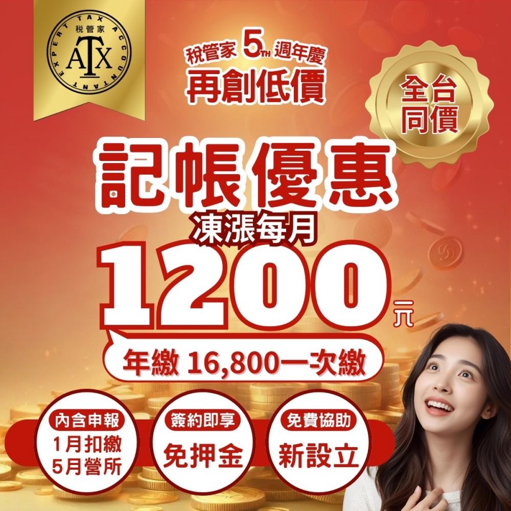 歡慶5週年*再創低價*全台同慶:記帳凍漲每月只要1,200(年繳優惠),#含申報 #簽約免押金 #免費協助新設立