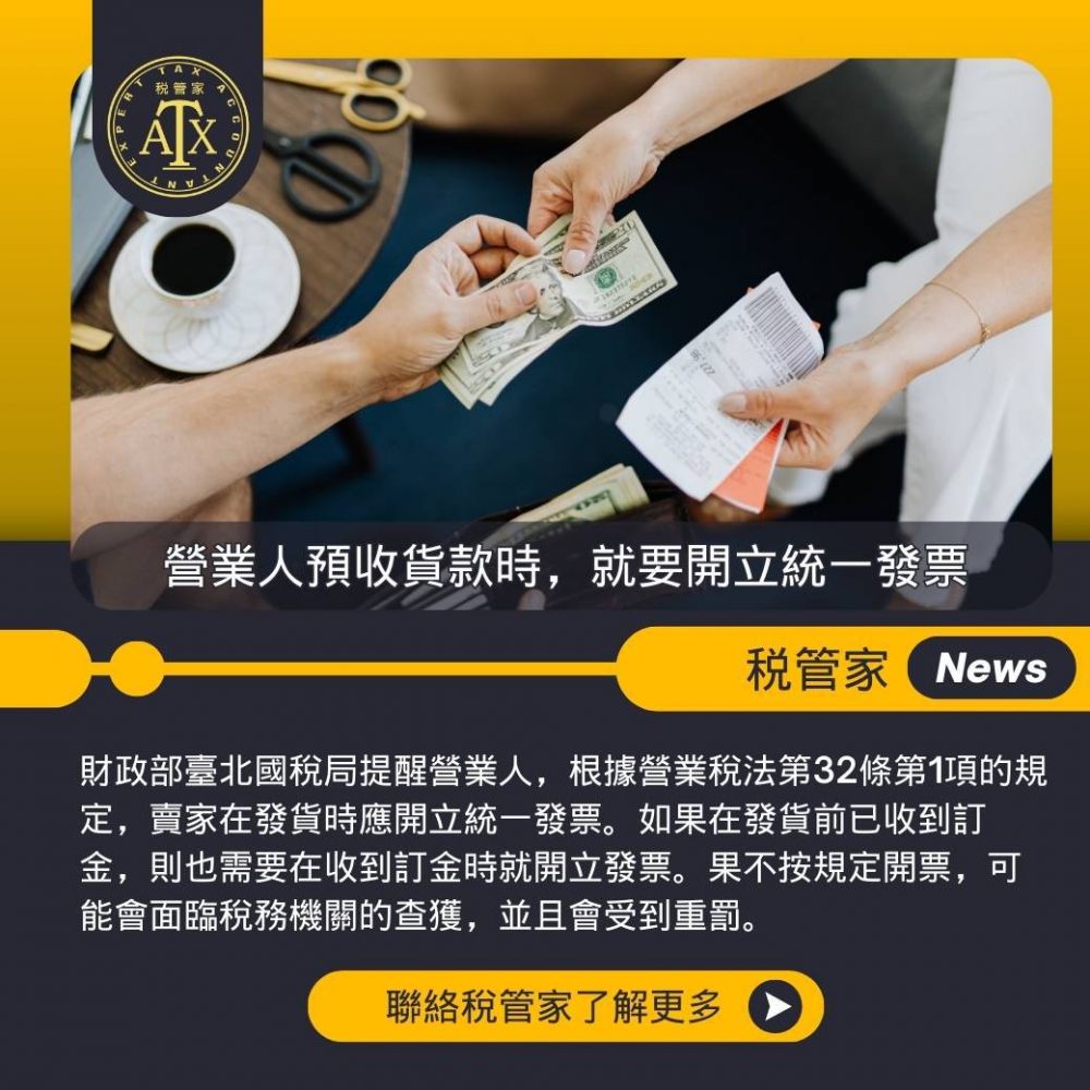 「我買賣東西,先跟客人收取訂金,要先開發票嗎?可以等尾款再一起開嗎?」財政部臺北國稅局表示,營業人銷售貨物若於交付貨物前預先收取價款者,應依...